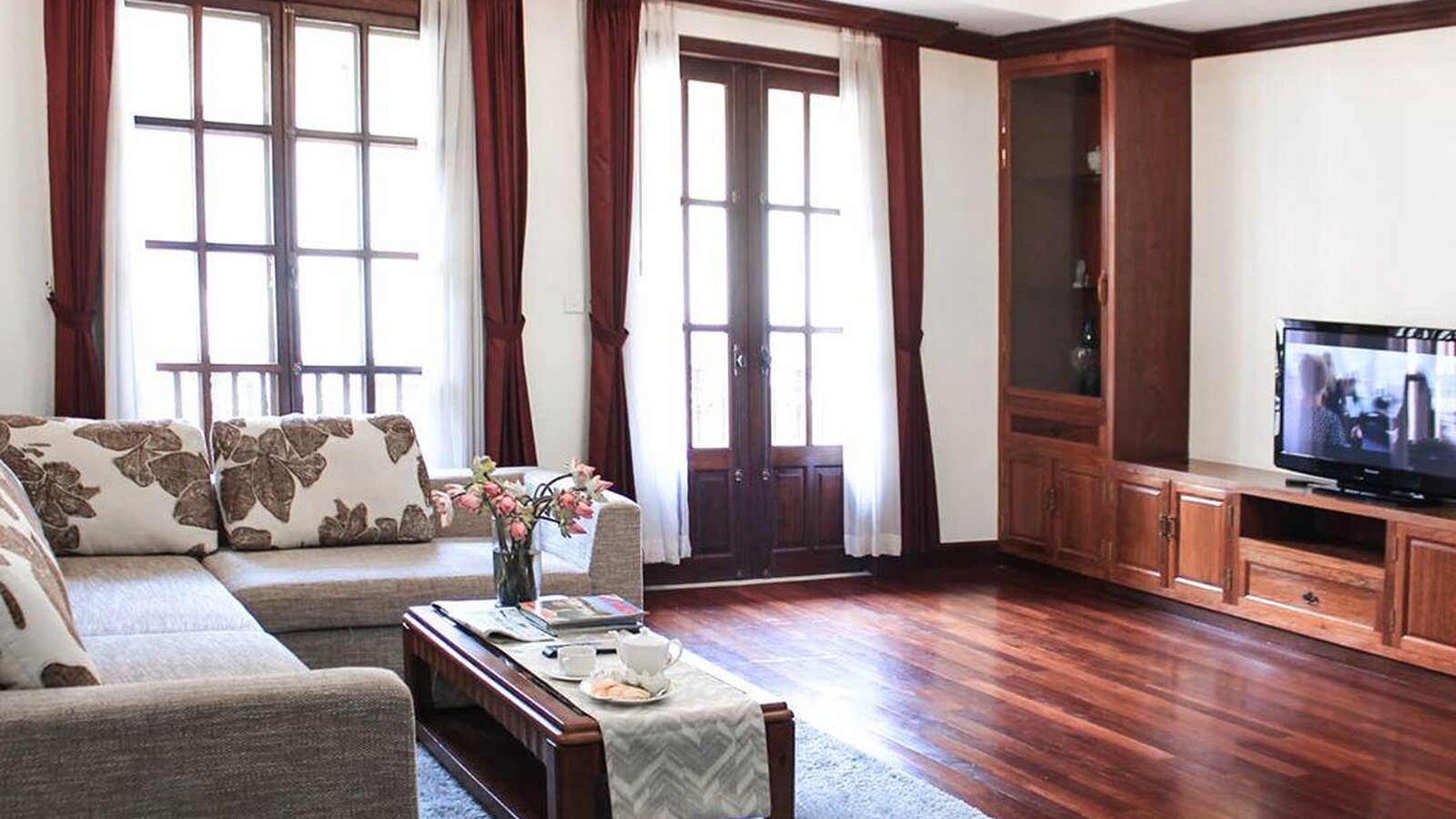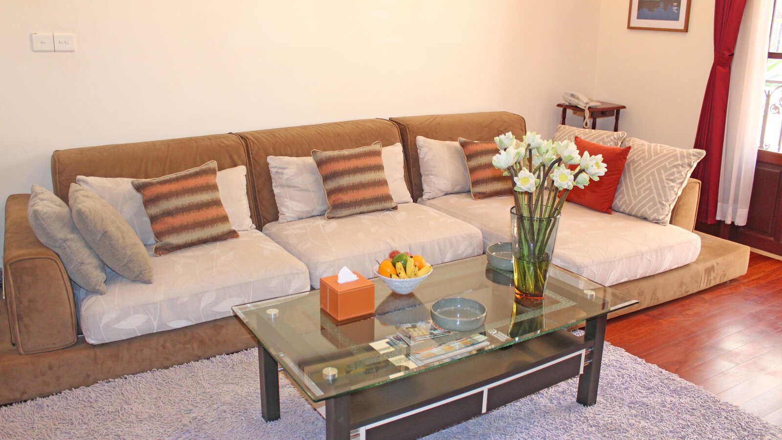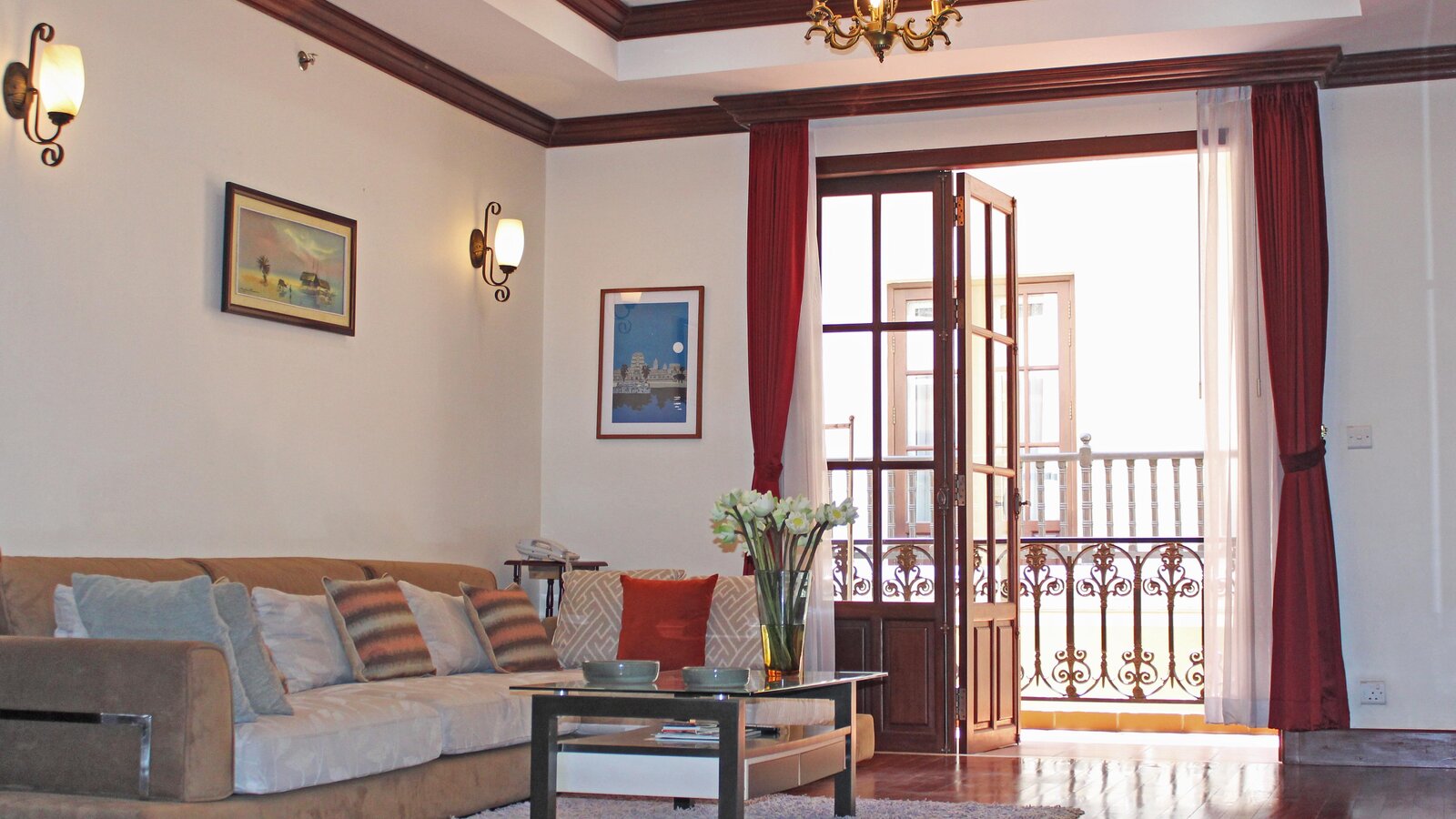 A large and spacious accommodation with fully-equipped open kitchen, sitting area, separate bedroom and bath. Hardwood floor, off-white walls and ceilings. Private balcony with city view.